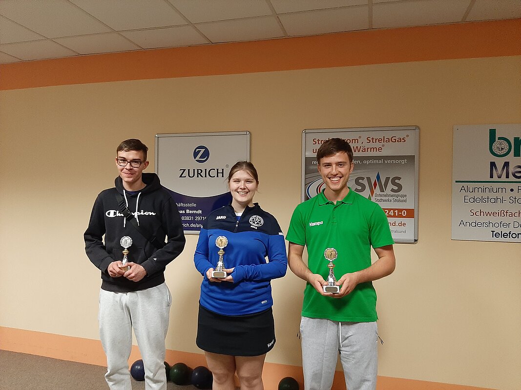 Bei den Junioren erreichte Julian Kossow mit 807 Holz den 2.Platz . Kathrin Theiss aus Ribnitz wurde mit 822 Holz Dritte bei den Damen A . Beide qualifizierten sich damit für die Landesmeisterschaften am 07.05.2023 in L üneburg .